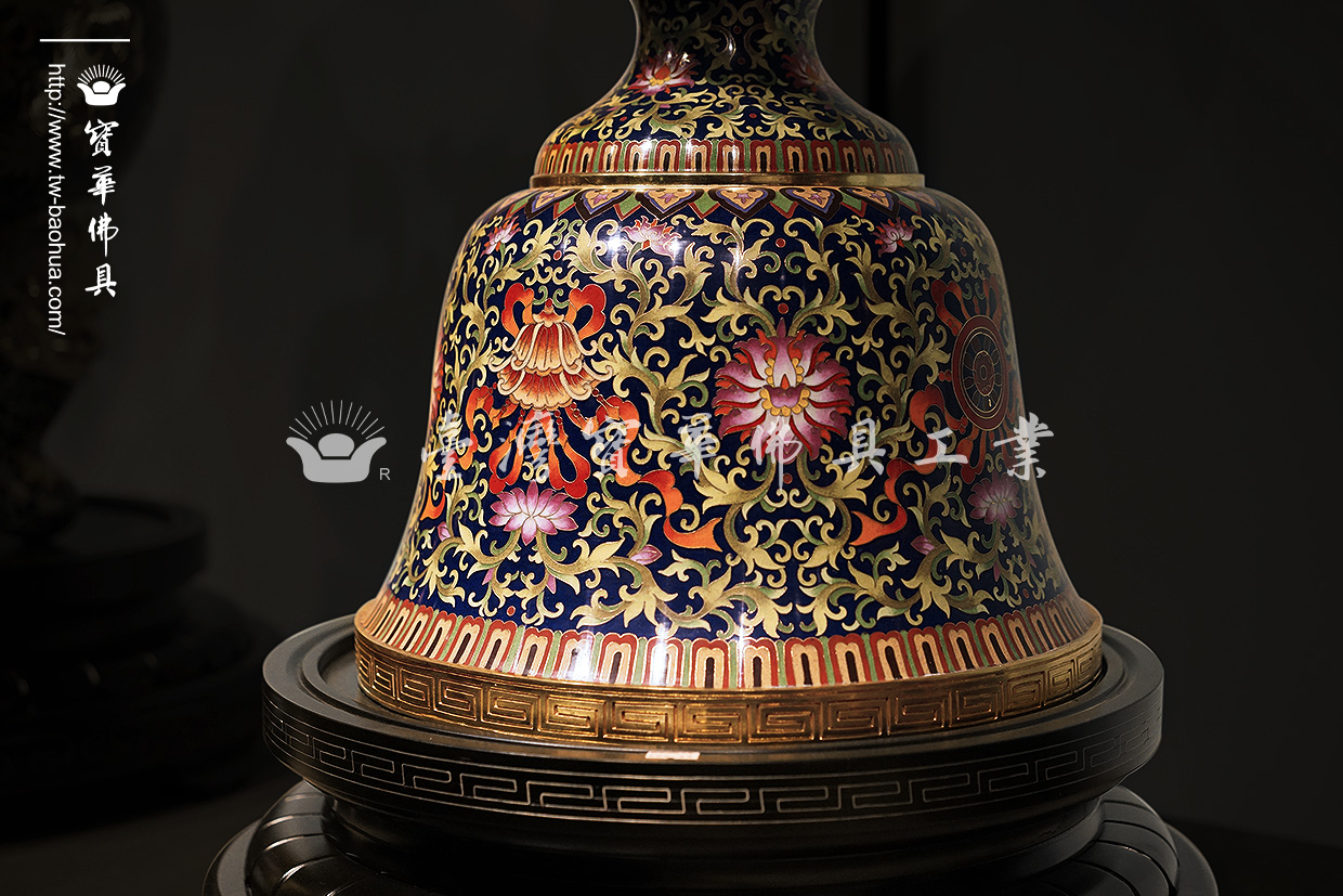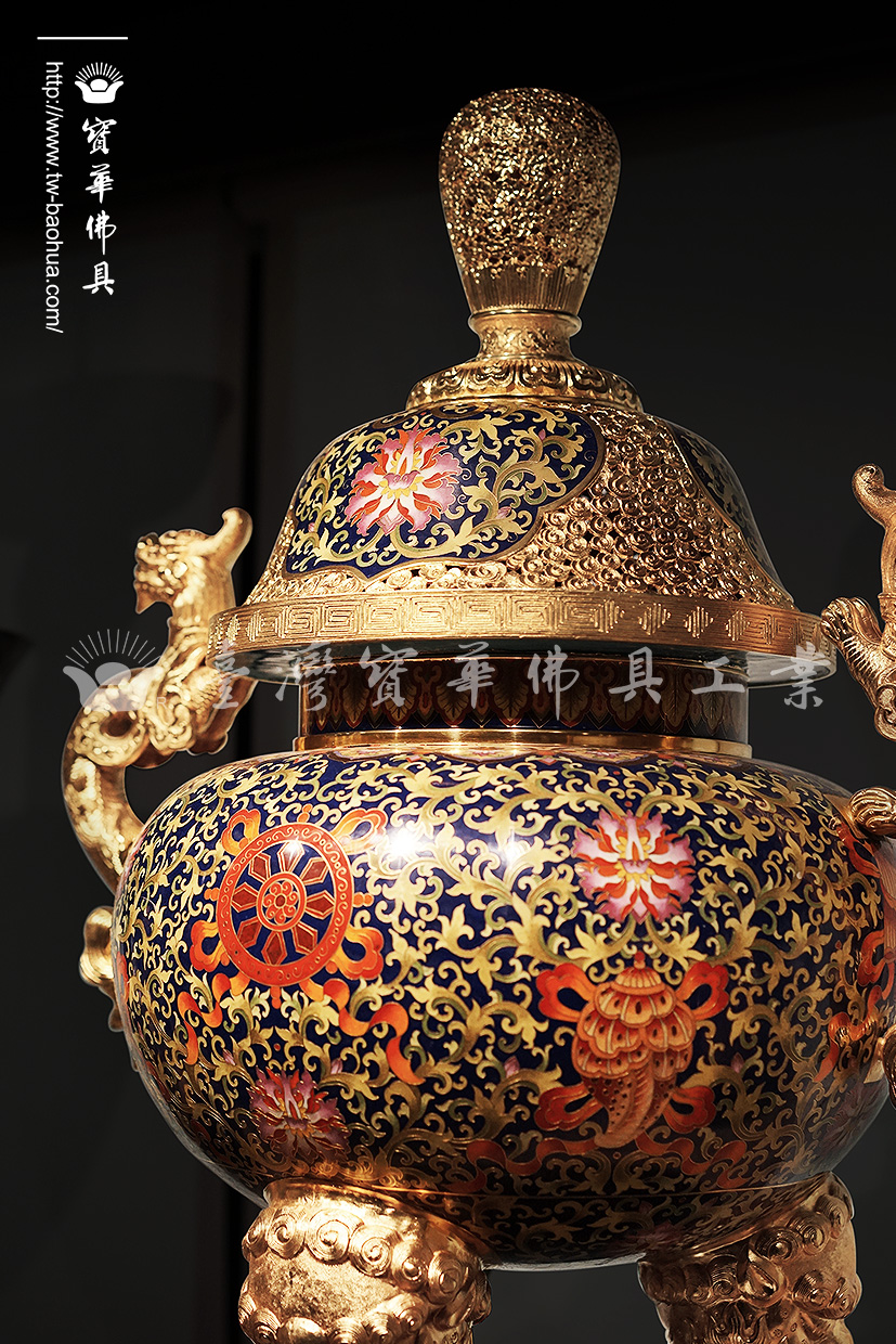 其胎體為紫銅手工打造而成,以紫銅線(掐絲)勾勒出圖案,再填入礦物粉末燒結而成琺瑯,其過程得反覆數次填料燒結,直至琺瑯滿滿覆蓋表面後,方可研磨打亮。