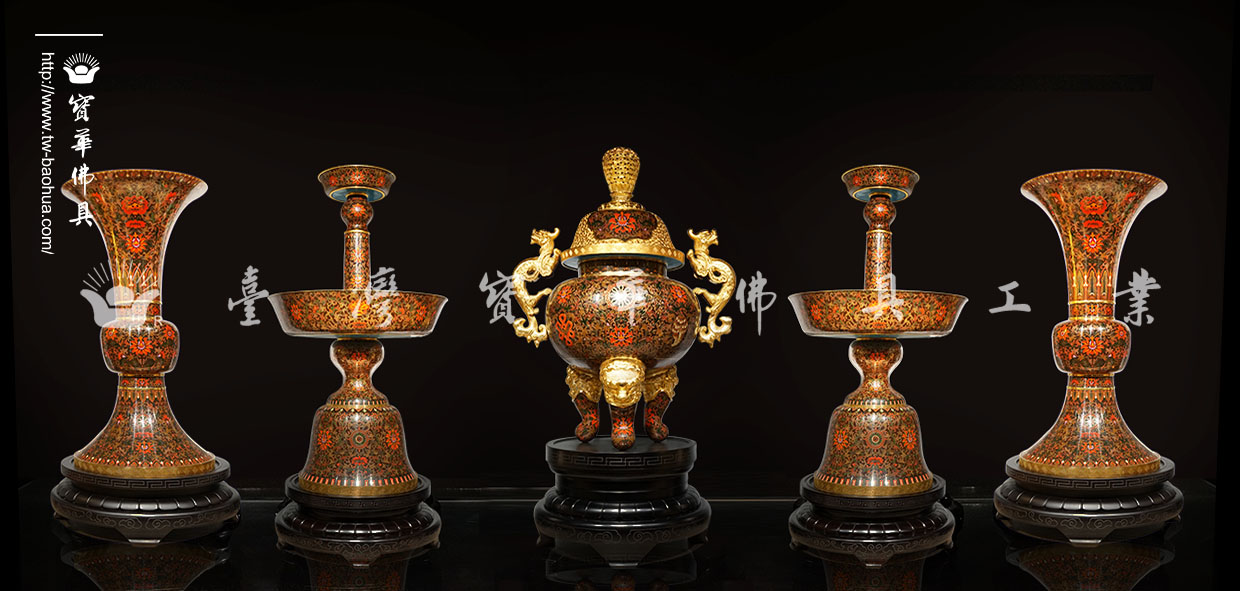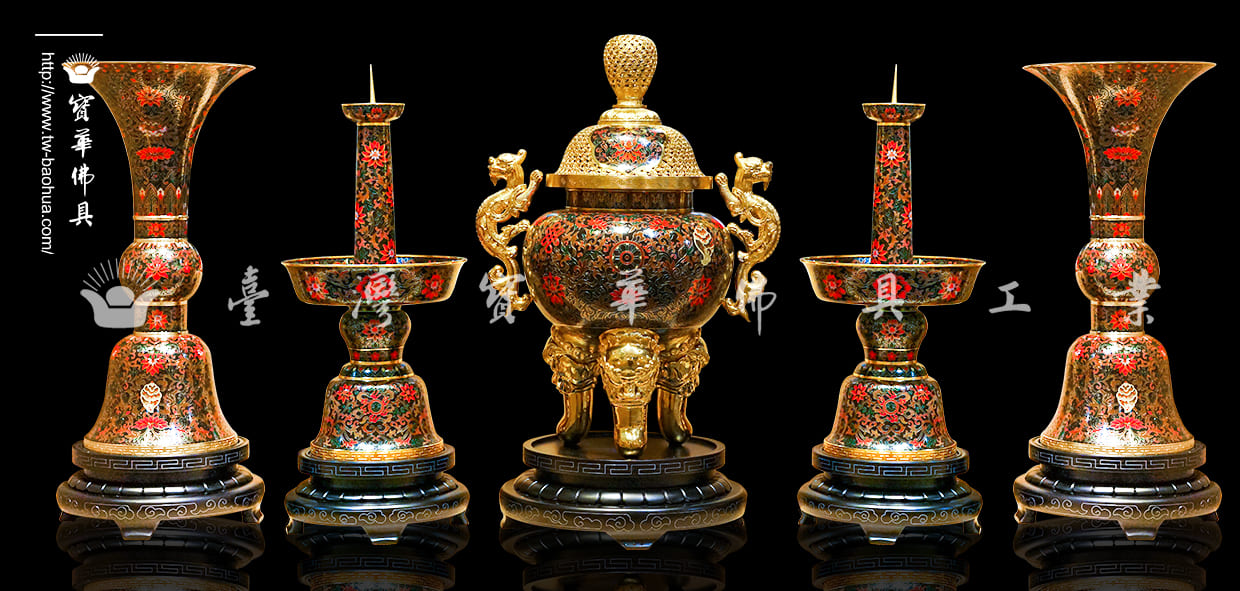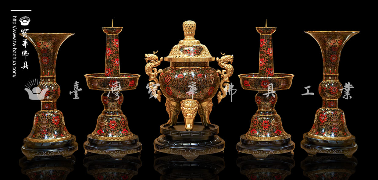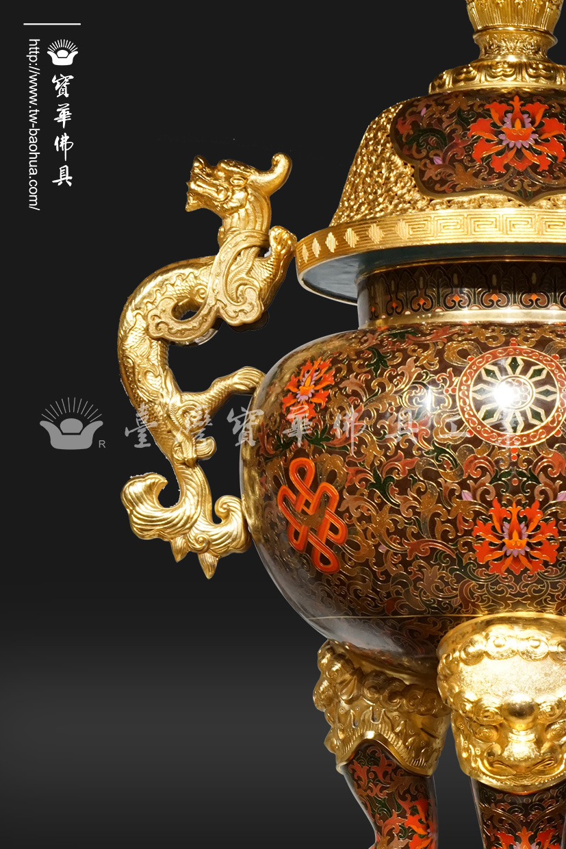 其胎體為紫銅手工打造而成,以紫銅線(掐絲)勾勒出圖案,再填入礦物粉末燒結而成琺瑯,其過程得反覆數次填料燒結,直至琺瑯滿滿覆蓋表面後,方可研磨打亮。
