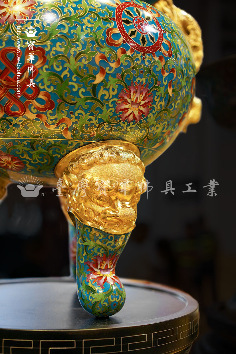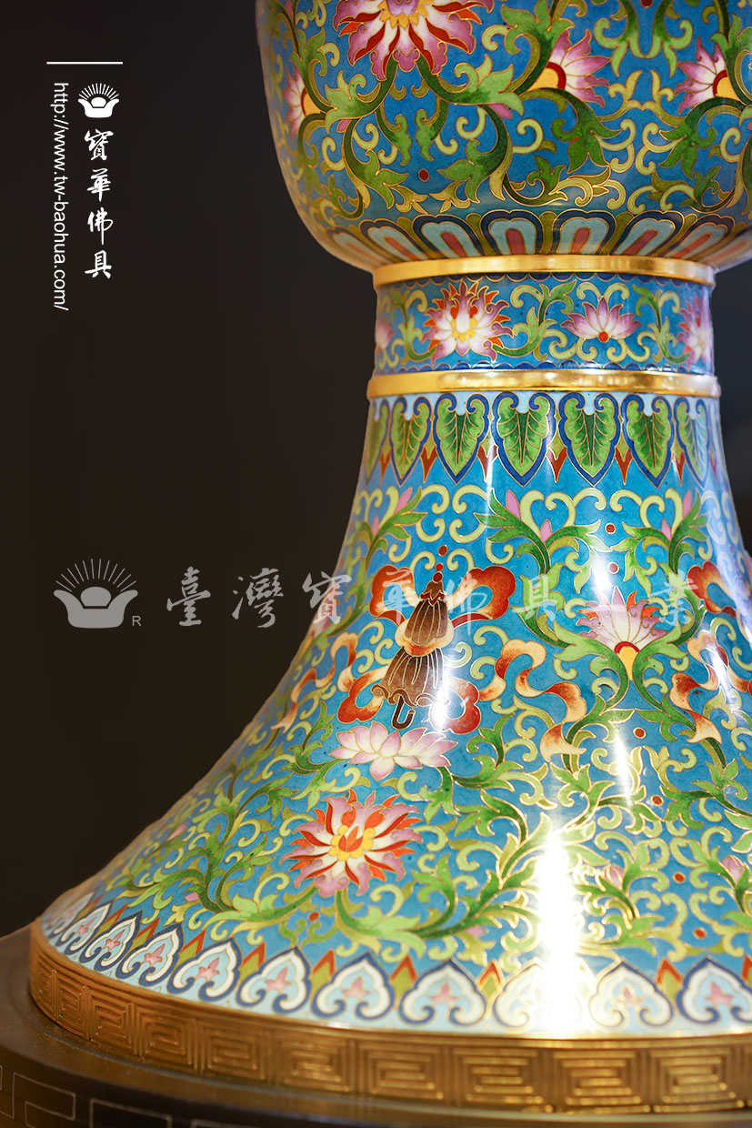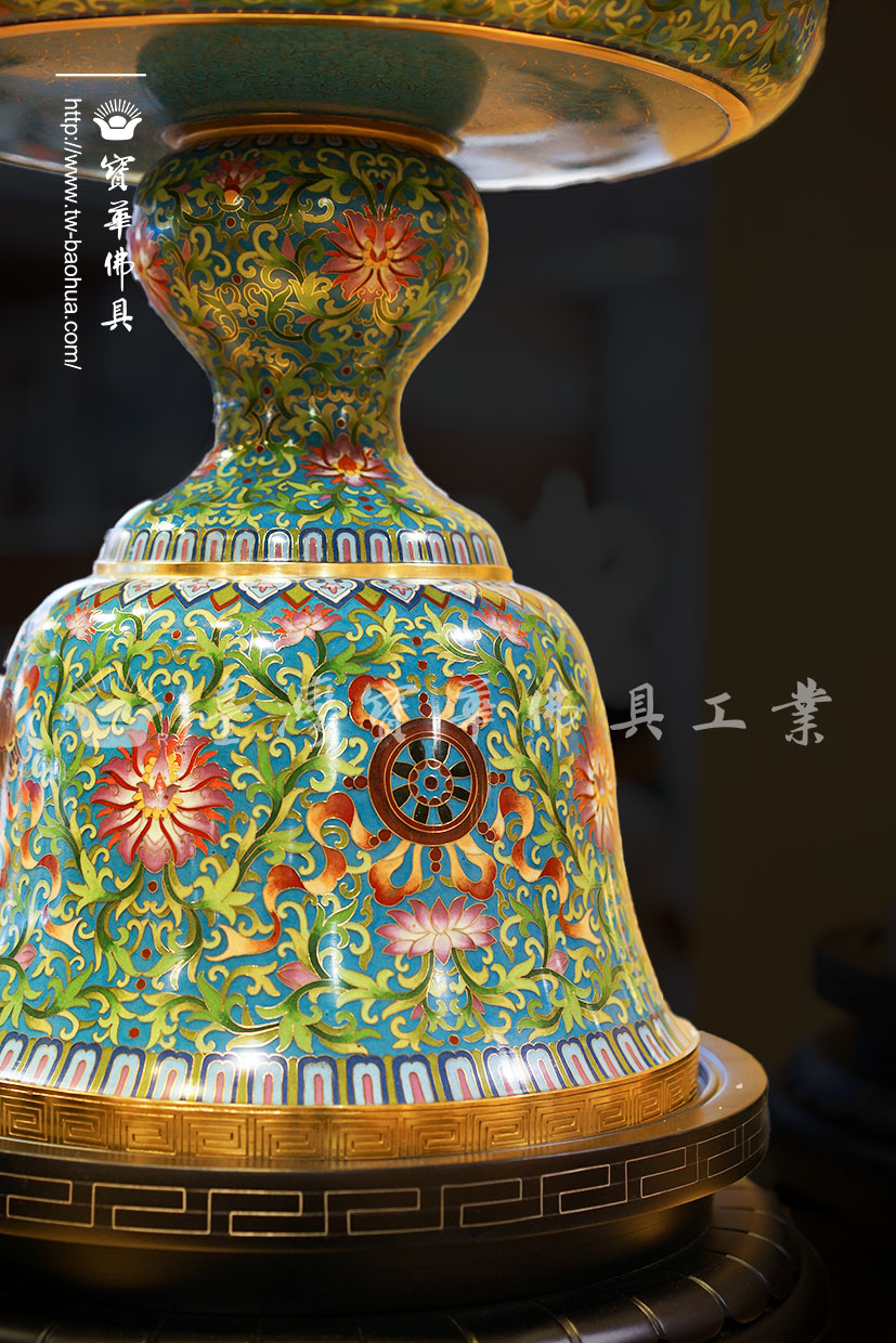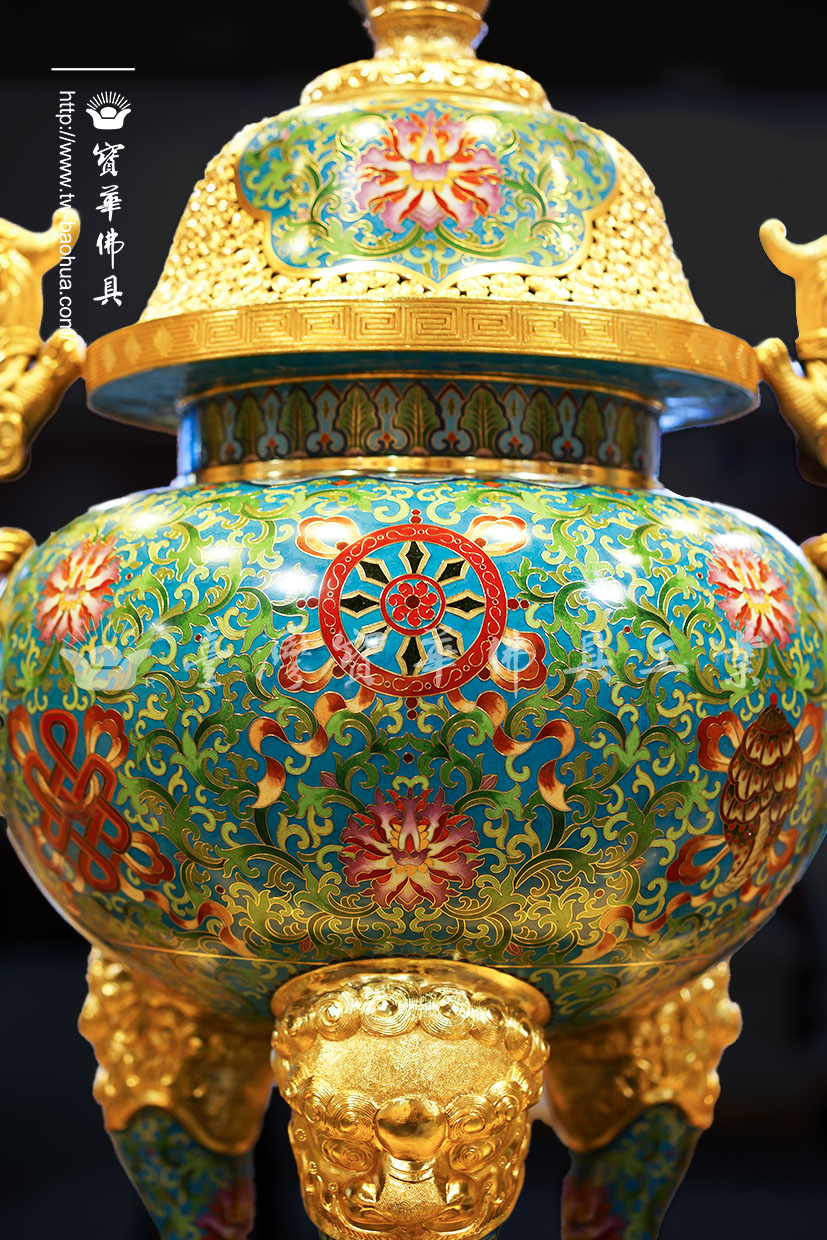 其胎體為紫銅手工打造而成,以紫銅線(掐絲)勾勒出圖案,再填入礦物粉末燒結而成琺瑯,其過程得反覆數次填料燒結,直至琺瑯滿滿覆蓋表面後,方可研磨打亮。
