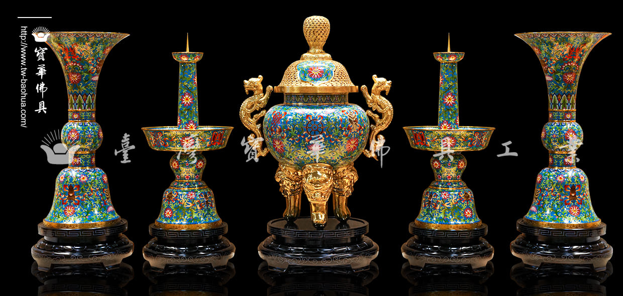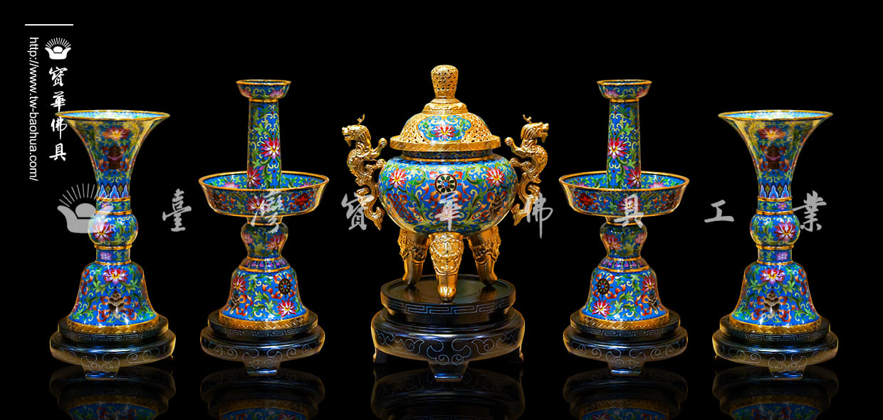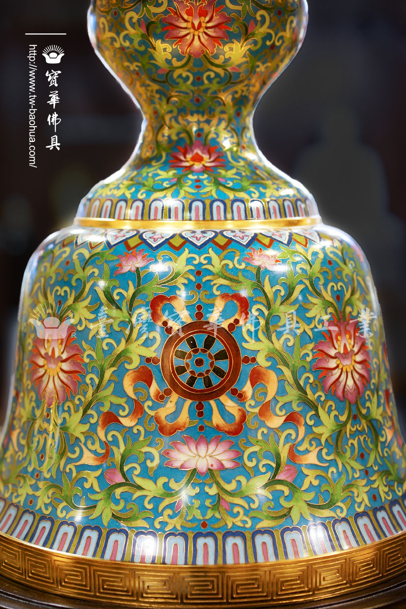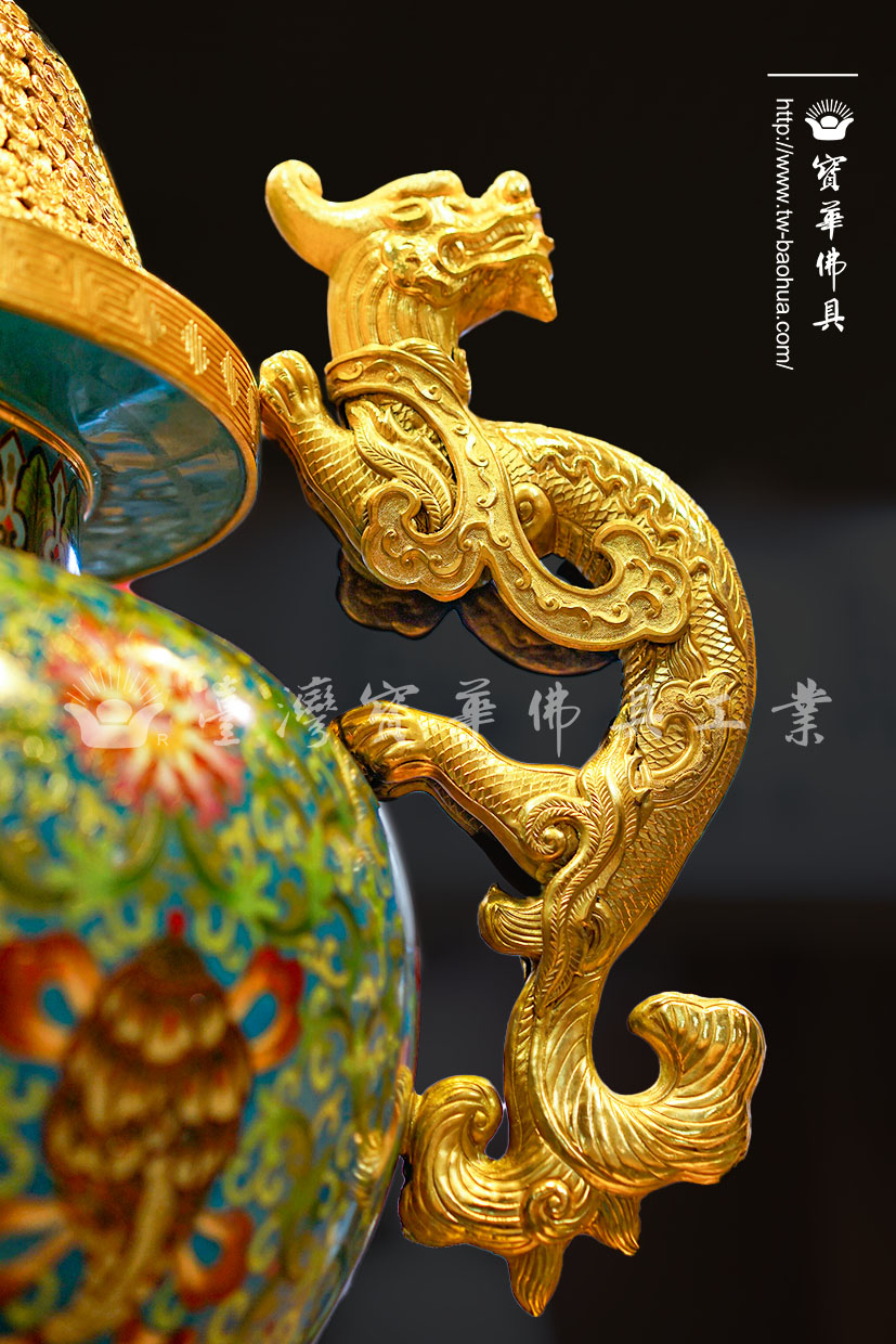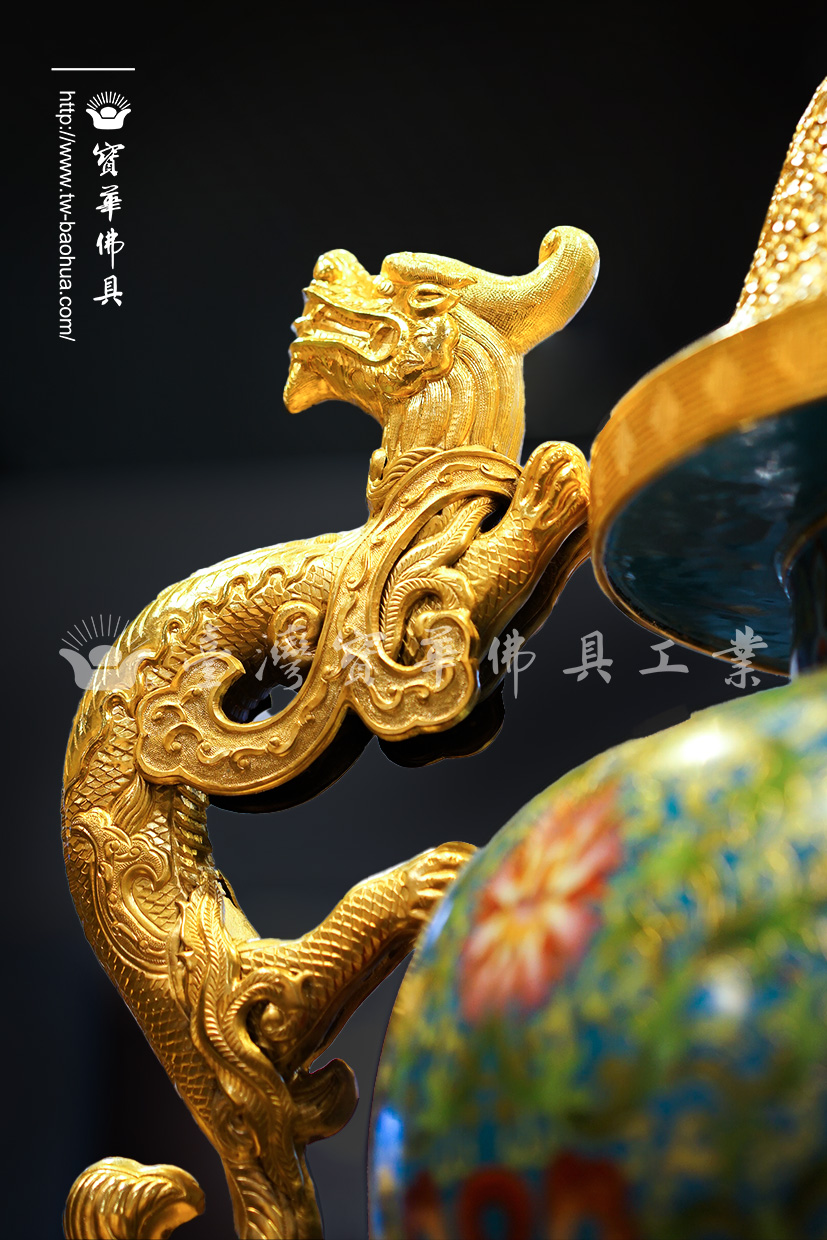 其胎體為紫銅手工打造而成,以紫銅線(掐絲)勾勒出圖案,再填入礦物粉末燒結而成琺瑯,其過程得反覆數次填料燒結,直至琺瑯滿滿覆蓋表面後,方可研磨打亮。