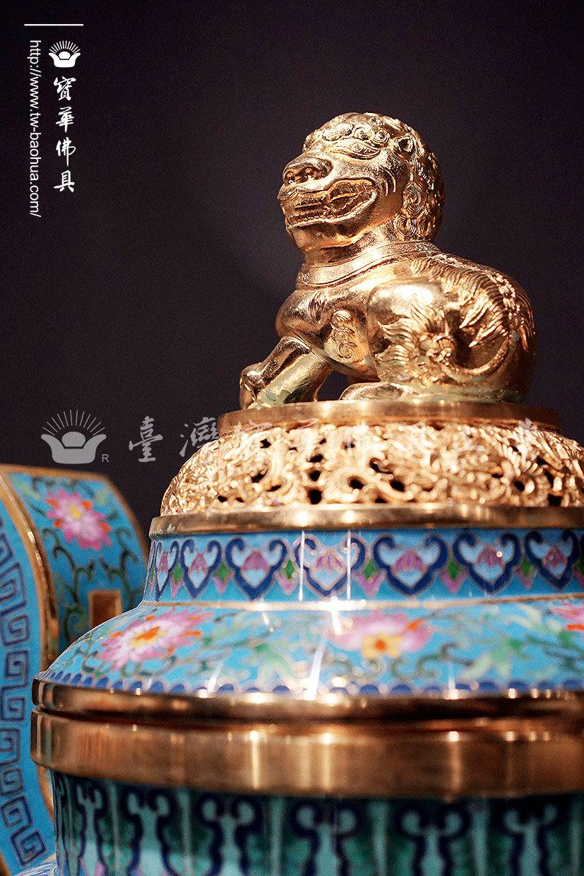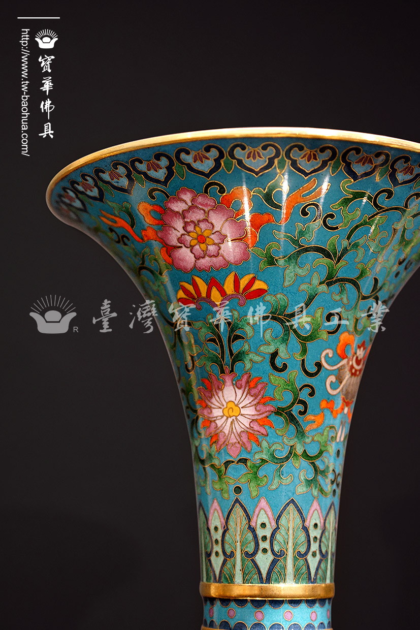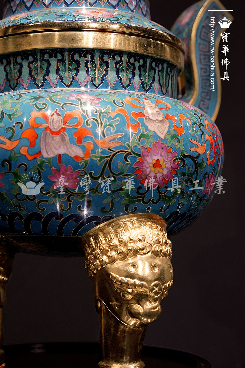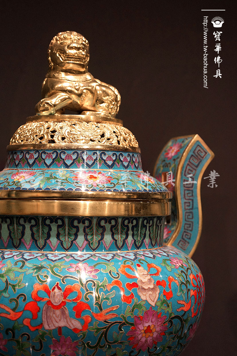 其胎體為紫銅手工打造而成,以紫銅線(掐絲)勾勒出圖案,再填入礦物粉末燒結而成琺瑯,其過程得反覆數次填料燒結,直至琺瑯滿滿覆蓋表面後,方可研磨打亮。