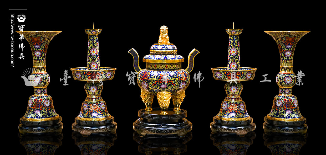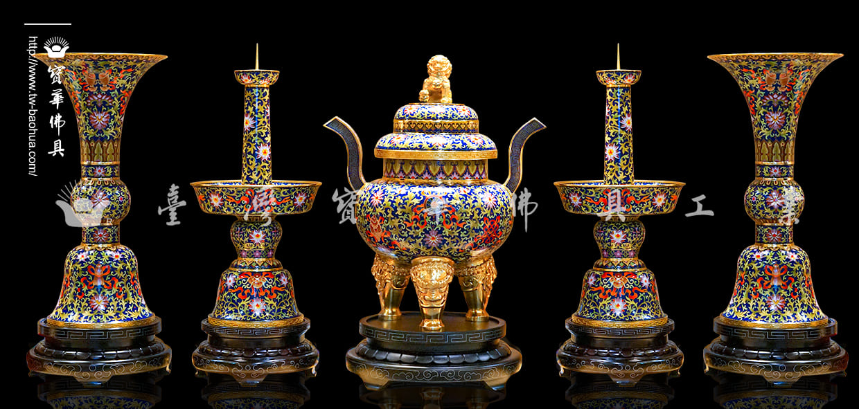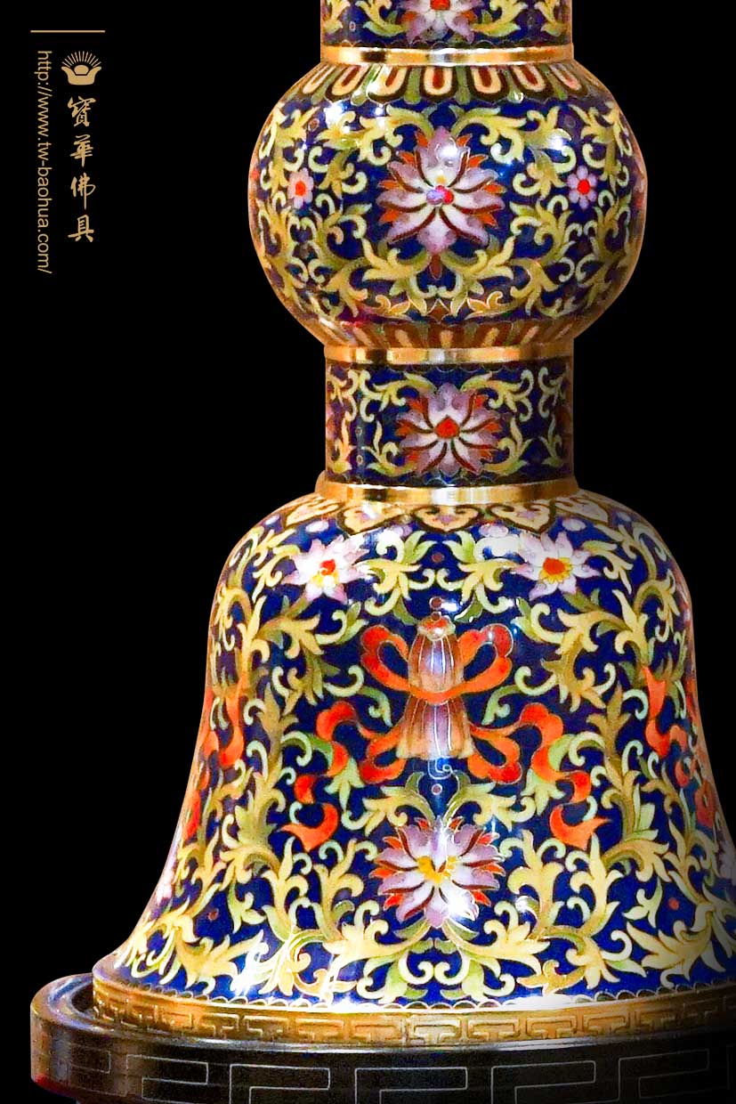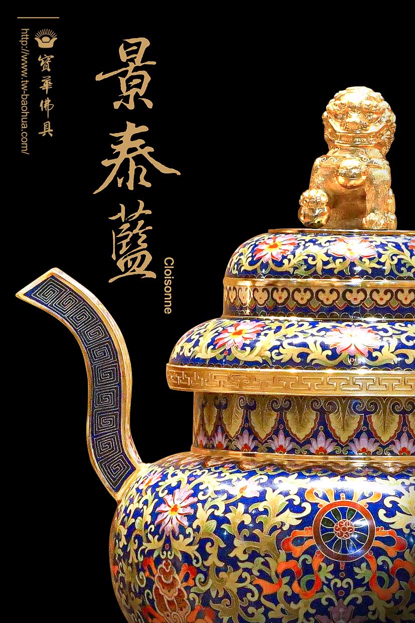 其胎體為紫銅手工打造而成,以紫銅線(掐絲)勾勒出圖案,再填入礦物粉末燒結而成琺瑯,其過程得反覆數次填料燒結,直至琺瑯滿滿覆蓋表面後,方可研磨打亮。