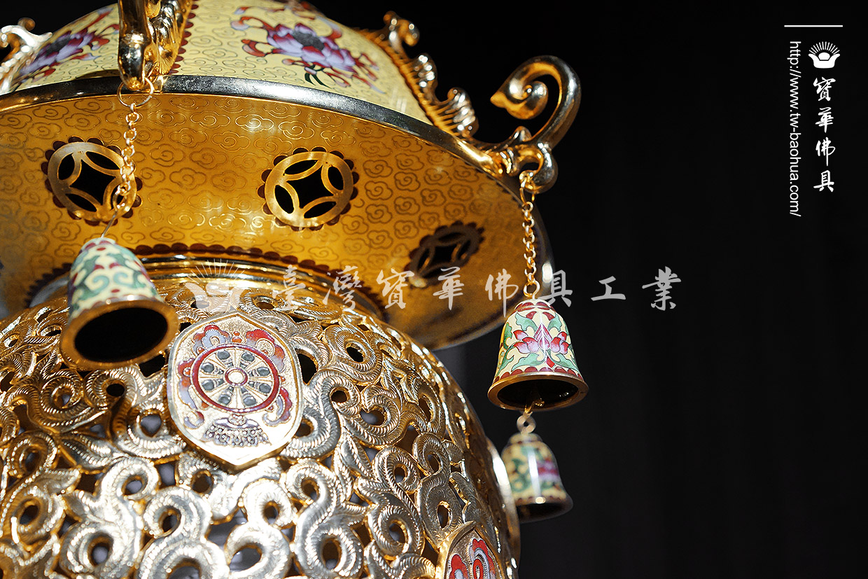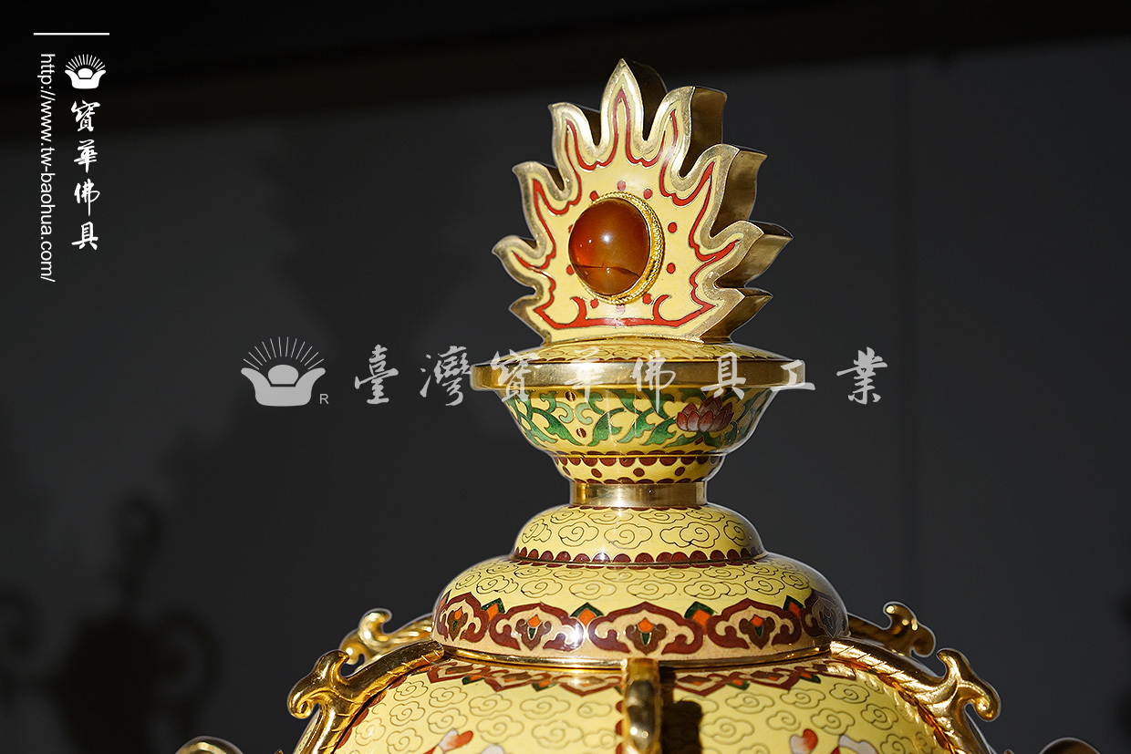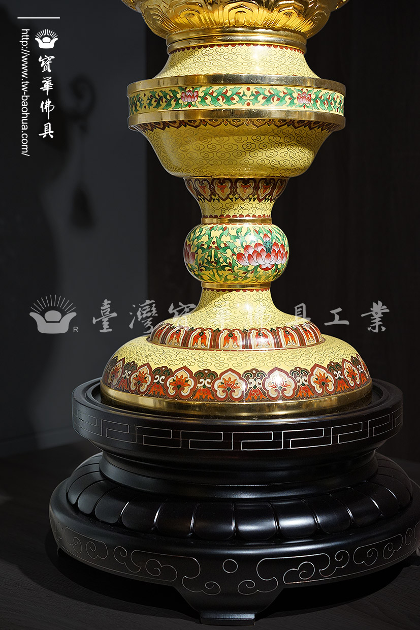 其胎體為紫銅手工打造而成,以紫銅線(掐絲)勾勒出圖案,再填入礦物粉末燒結而成琺瑯,其過程得反覆數次填料燒結,直至琺瑯滿滿覆蓋表面後,方可研磨打亮。