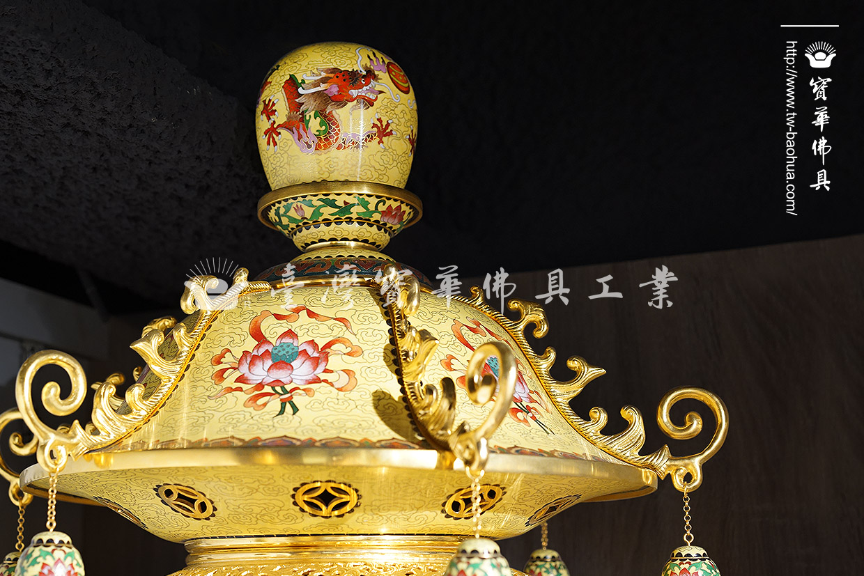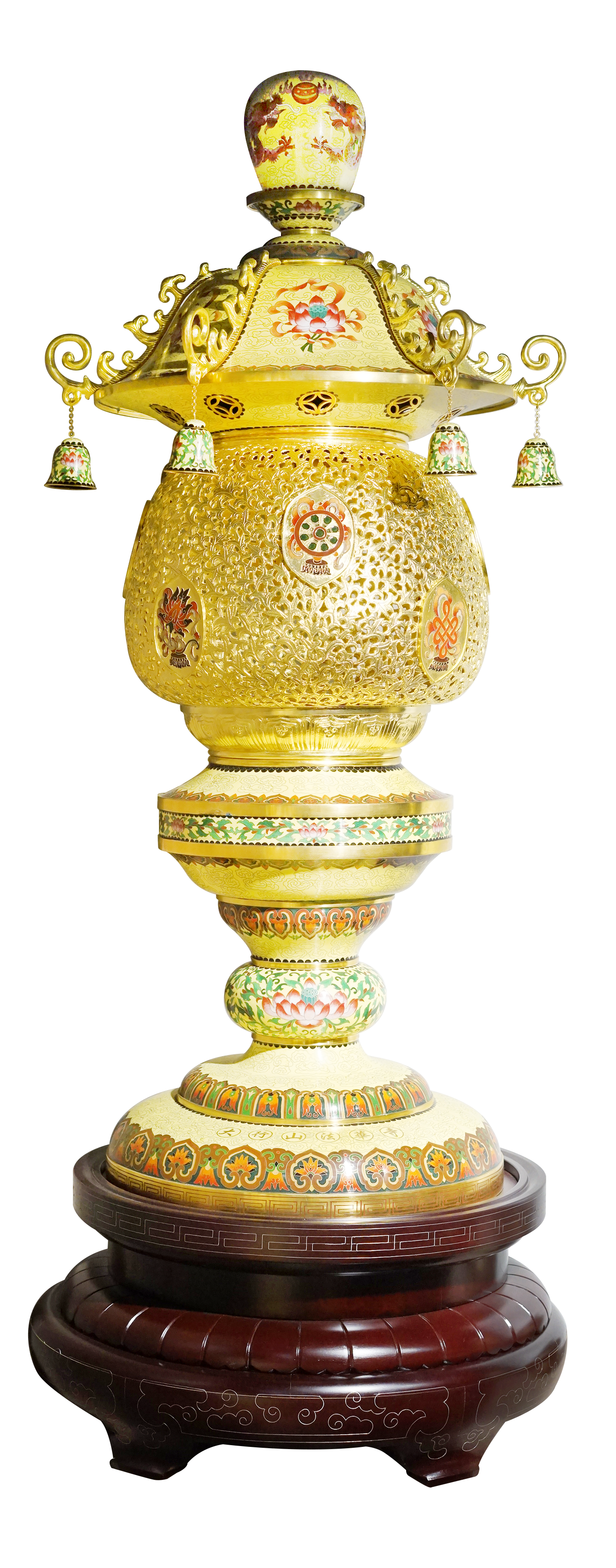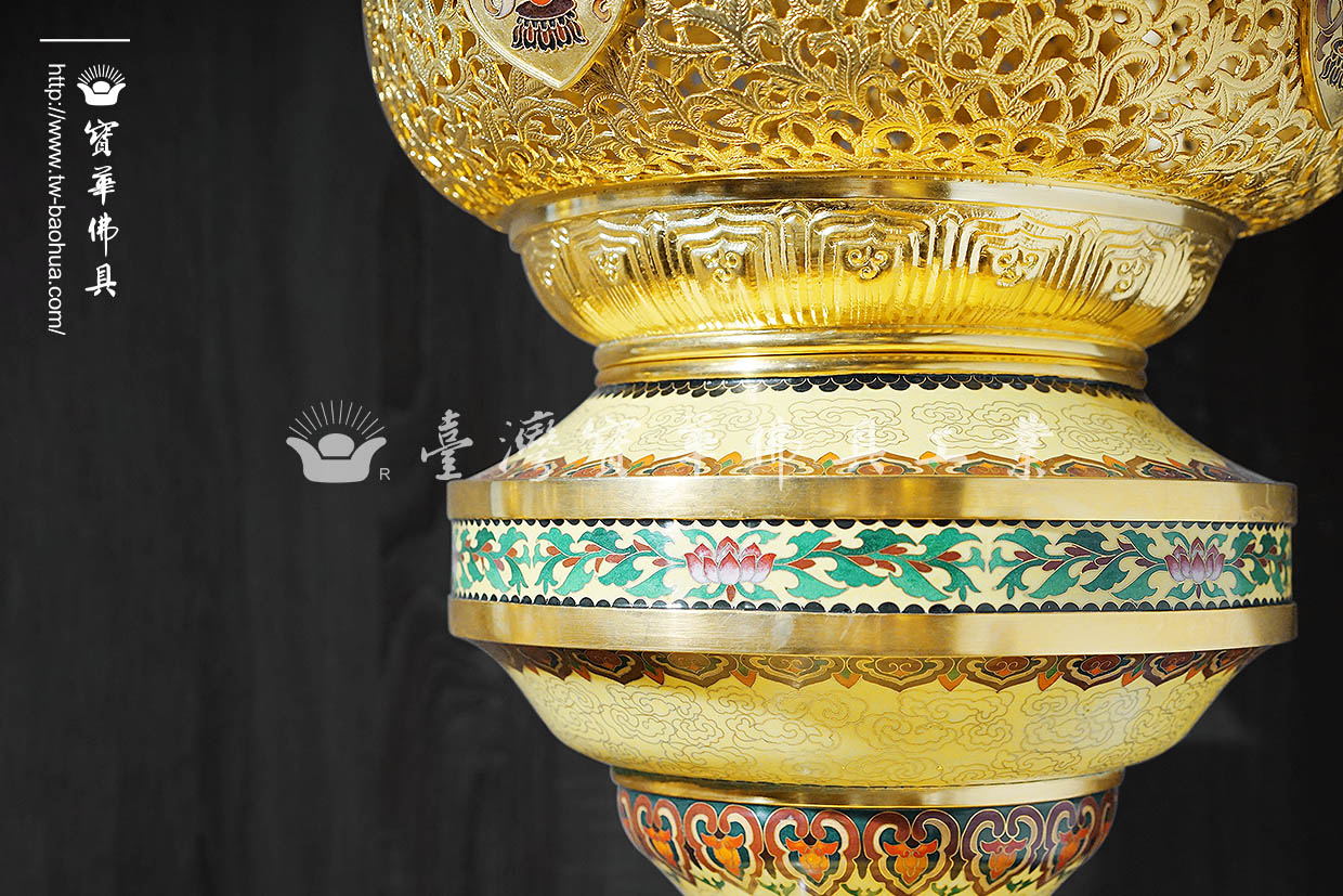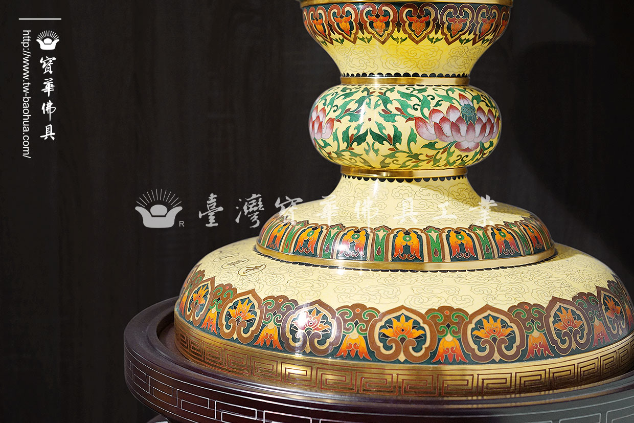 其胎體為紫銅手工打造而成,以紫銅線(掐絲)勾勒出圖案,再填入礦物粉末燒結而成琺瑯,其過程得反覆數次填料燒結,直至琺瑯滿滿覆蓋表面後,方可研磨打亮。