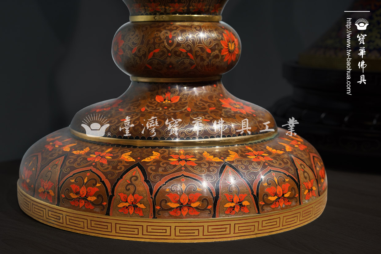 其胎體為紫銅手工打造而成,以紫銅線(掐絲)勾勒出圖案,再填入礦物粉末燒結而成琺瑯,其過程得反覆數次填料燒結,直至琺瑯滿滿覆蓋表面後,方可研磨打亮。