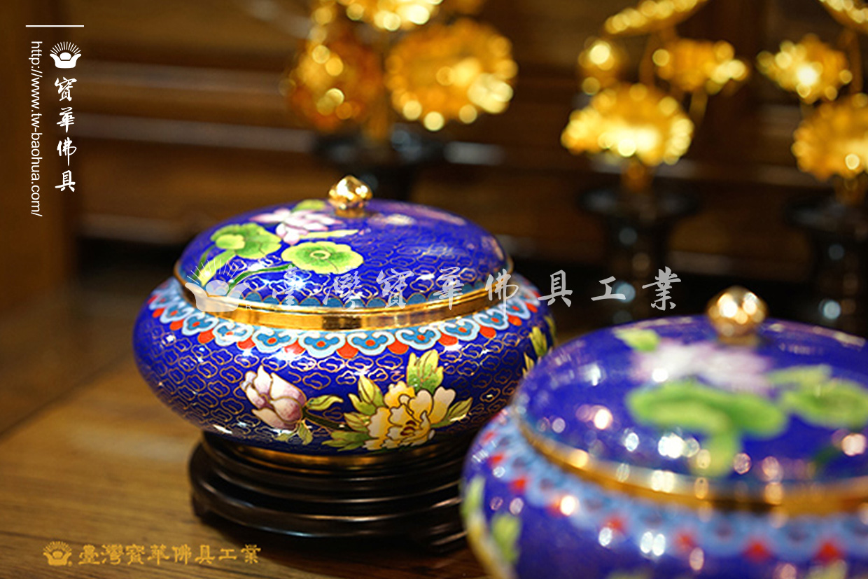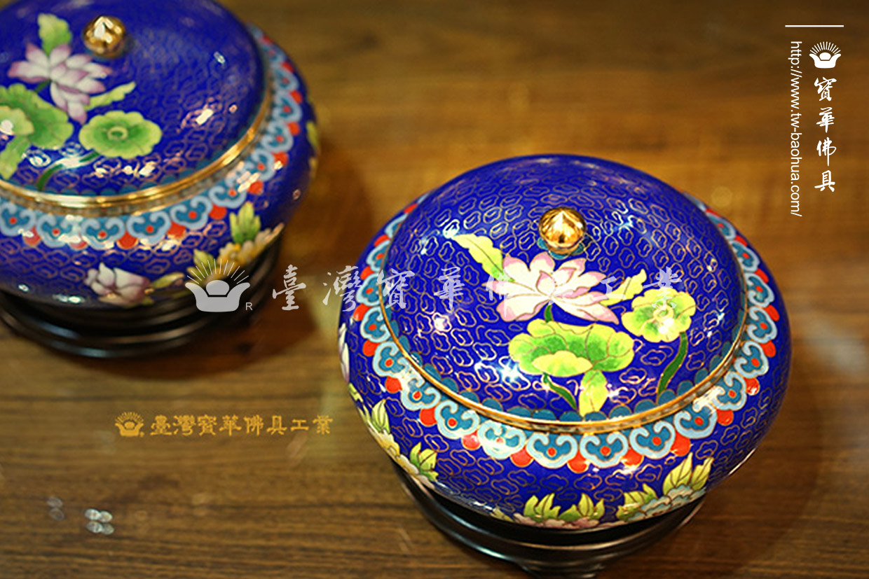其胎體為紫銅手工打造而成,以紫銅線(掐絲)勾勒出圖案,再填入礦物粉末燒結而成琺瑯,其過程得反覆數次填料燒結,直至琺瑯滿滿覆蓋表面後,方可研磨打亮。