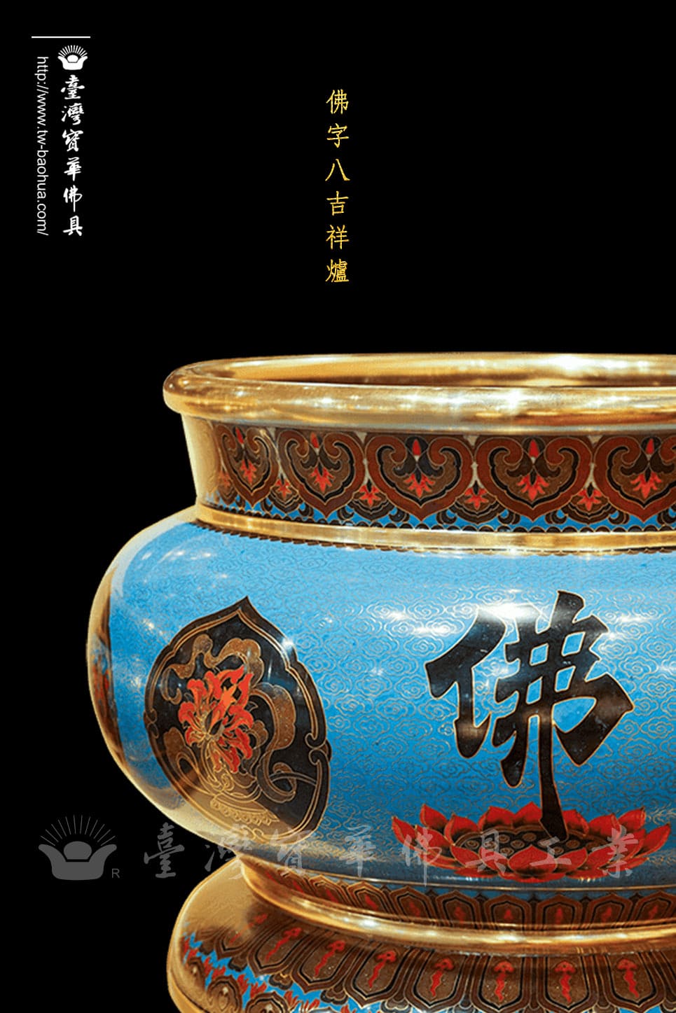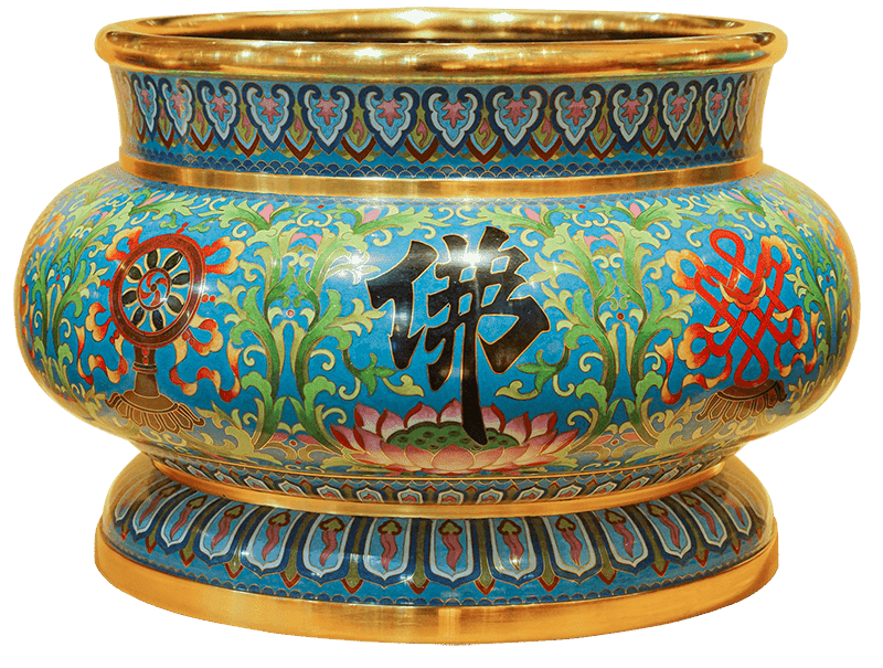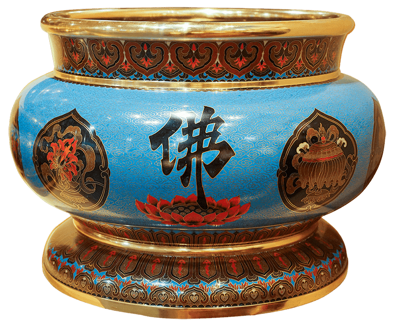 其胎體為紫銅手工打造而成,以紫銅線(掐絲)勾勒出圖案,再填入礦物粉末燒結而成琺瑯,其過程得反覆數次填料燒結,直至琺瑯滿滿覆蓋表面後,方可研磨打亮。